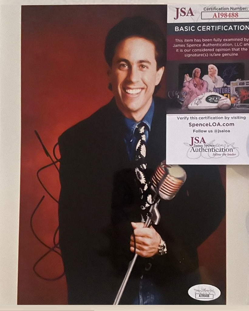 VERY difficult to acquire 8x10-inch color portrait of the comedian and star of T.V.'s absurdist sitcom "Seinfeld" (1989-1998), boldly signed in black felt-tip marker in-person for a busy Los Angeles, California-based autograph collector in the 1990s. In good condition, with a sticker from the third-party authentication service J.S.A. affixed to the lower right-hand corner tip and its accompanying certificate. Genuine examples are extremely elusive!