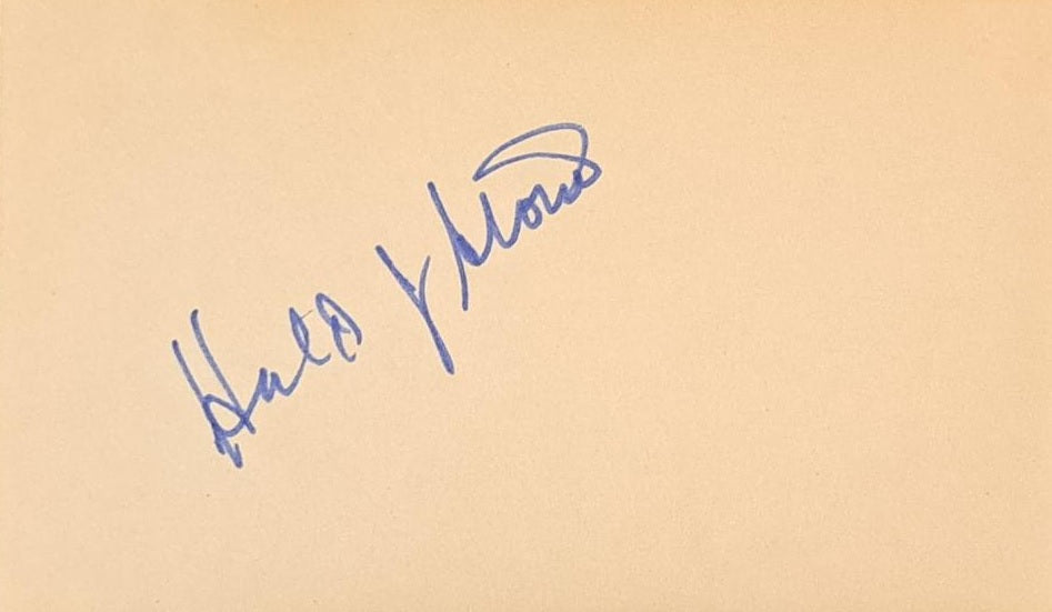 Scarce vintage blue fountain pen signature on a 3x5-inch tan card of the superb, prolific television and movie character actor, acquired in-person by an inveterate autograph hound in the 1960s. In good condition and nice for matting with a favorite photograph.