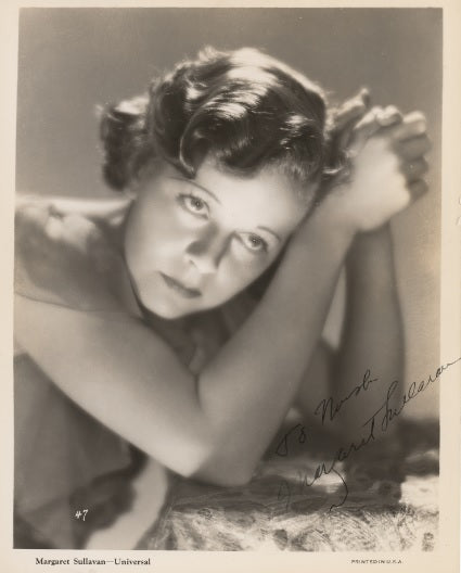 Previously sold at RR Auction: RARE and very early 8x10-inch black and white Universal Studios portrait, boldly signed and inscribed in black fountain pen in the earliest days of her career, with a notation on the verso indicating that it was acquired in June of 1936, almost certainly in-person, while she was appearing in New Faces of 1936 at the Vanderbilt Theatre. In fine condition for its age, with some light creases and marks. Sad-eyed Margaret Sullavan was Oscar-nominated for Three Comrades (1938), and elsewhere memorable in Little Man, What Now? (1934), So Red the Rose (1935), The Moon's Our Home (1936), The Shopworn Angel (1938), The Shining Hour (1938), The Shop Around the Corner (1940), The Mortal Storm (1940), So Ends Our Night (1941), Cry 'Havoc' (1943), and No Sad Songs for Me (1950). She committed suicide by overdose at the age of 50 and her autograph is quite elusive in any format.