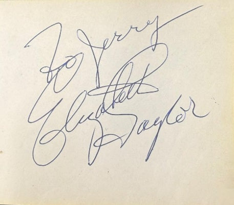 Highly rare-- in the sense that it's not one of the countless secretarially-signed or crudely faked examples one so commonly encounters-- inscribed blue ballpoint pen signature on a 4x6-inch tan autograph album page, acquired in-person in the late 1950s. In good condition. After being nominated for three Academy Awards, for Raintree Country (1957), Cat on a Hot Tin Roof (1958) and Suddenly, Last Summer (1959), beautiful, iconic Elizabeth Taylor snagged two Oscars for BUtterfield 8 (1960) and Who's Afraid of Virginia Woolf? (1966). Elsewhere, she blossomed from an adorable tot into an electrifying leading lady in Hollywood classics like Lassie Comes Home (1942), Jane Eyre (1943), National Velvet (1944), Life with Father (1947), Little Women (1949), Father of the Bride (1950), Father's Little Dividend (1951), A Place in the Sun (1951), Ivanhoe (1952), Giant (1956), Cleopatra (1963), The Sandpiper (1965), and The Taming of the Shrew (1967).