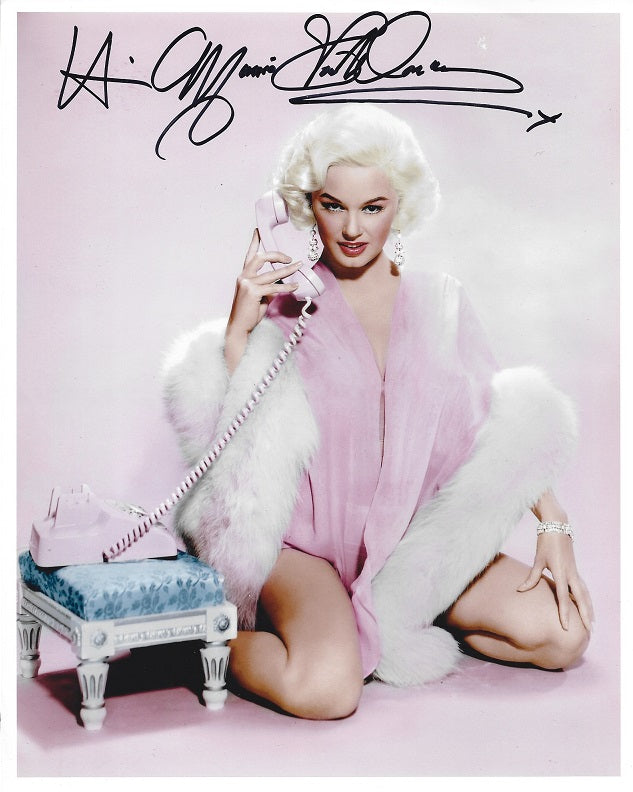 Sexy 8x10-inch color cheesecake portrait in her prime, boldly signed in black felt-tip marker in-person at a film convention appearance around two decades ago. In good condition. Busty blonde model and big bang singer Mamie Van Doren entered films in the early 1950s, memorably portraying Peggy DeFore in the romantic comedy Teacher's Pet (1956). Although often compared with Marilyn Monroe and Jayne Mansfield, the other two of the fabled "Three Ms", Van Doren was far more versatile, equally adept at playing innocent Kewpie dolls and heartless bad girls. From the late 1950s onward, she was increasingly relegated to horror, sci-fi, fantasy, and sexploitation B-movies, including Untamed Youth (1957), The Girl in Black Stockings (1957), High School Confidential! (1958), The Beat Generation (1959), Girls Town (1959), The Big Operator (1959), Sex Kittens Go to College (1960), The Navy vs. the Night Monsters (1966), and Voyage to the Planet of Prehistoric Women (1968). She twice posed nude for Playboy in the 1960s, showing off her assets, of which she once quipped, "I don't want to call them double-Ds, because they're much bigger than that."