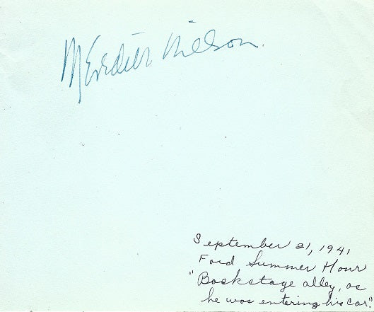 Scarce mattable vintage turquoise fountain pen signature on a 4x6-inch light blue autograph album page, acquired in-person-- as we was getting into a car, according to the original collector's notations!-- in 1949. In good condition. Brilliant Broadway composer, lyricist, composer, and arranger Meredith Willson-- a master of incorporating folksy dialects, wordplay and ambient sounds into his impossibly catchy tunes-- is remembered for the scores to "The Music Man" (1959) and "The Unsinkable Molly Brown" (1960). In addition to a Grammy Award for the original cast album for "The Music Man," he snagged two Oscar nominations for his scores for The Great Dictator (1941) and The Little Foxes (1942).